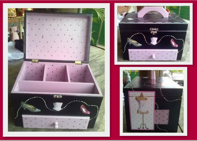 Taí um modelinho de caixa bem diferente dos que usalmente vemos. Olhando pela foto, parece que a artesã usou 1 outra caixinha em cada lateral, para montar este novo modelo. Sendo assim ou não, ficou uma graça e bem funcional. Saindo por $ 65,00.