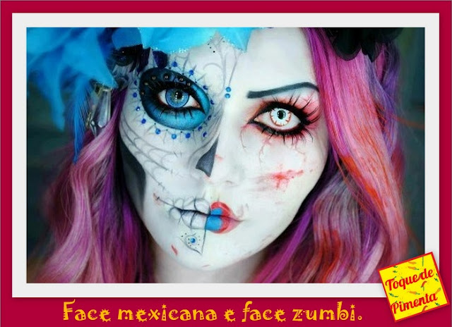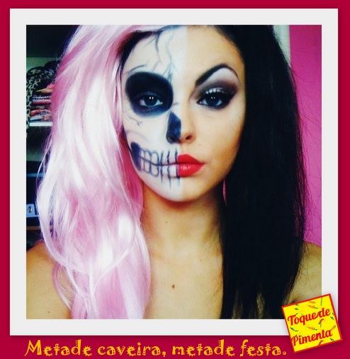 Outra opção bacana pra este Dia das Bruxas é fazer uma make de face dupla: aquela que metade do rosto é com uma maquiagem de um jeito e o outro lado de outro. Você pode optar por deixar metade da make toda linda e do outro lado fazer uma maquiagem “dark”, de vampiro, colorida, enfim, do jeito que a imaginação mandar.