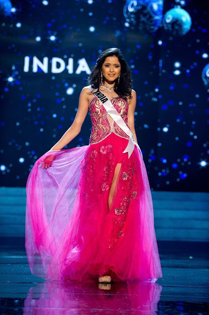 E que falar do vestido da candidata da India ? A tentativa de ser Barbie por um dia não colou. A cor foi uma péssima escolha, pois definitivamente não combinou com ela. Eu não sei se ela é tão sem cintura como na foto aparenta, mas desvalorizou o corpo. A fenda só piorou a situação, pois era desnecessária ainda mais nessa profundidade. Ela também poderia ter optado por outra cor de sapatos e acima de tudo ter coberto mais eles, como fizeram as outras candidatas. Péssimas escolhas, uma em cima da outra.