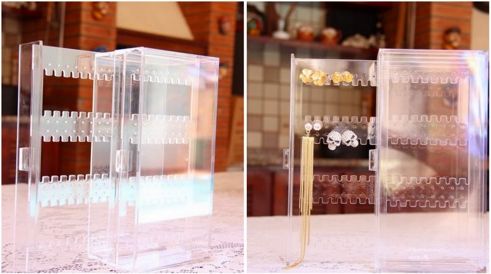 Olha que graça esse organizador de acrílico; ele é vertical, com duas gavetinhas que puxadas trazem duas paredes com furinhos pra você guardar os mais diversos brincos. Achei ótimo pra guardar principalmente os brincos menores.