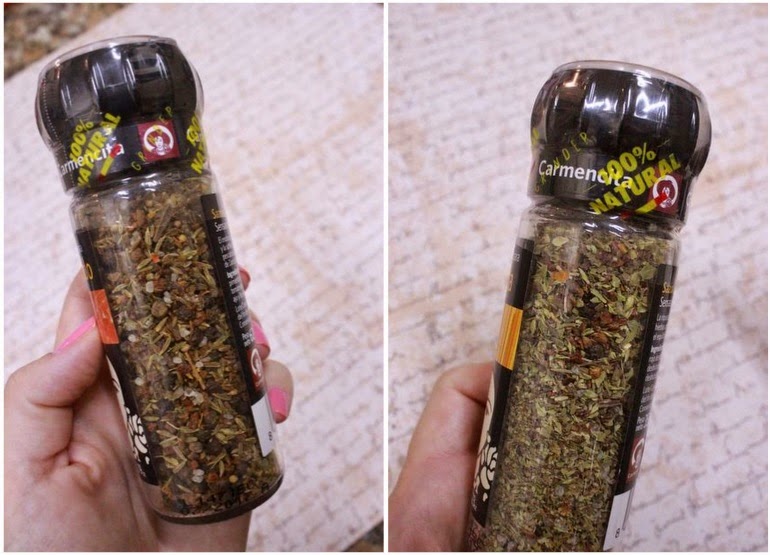 E teve ainda uns temperinhos prontos da marca espanhola Carmencita. O da esquerda é um tempero pronto para Pescados (tem sal marinho, pimentas cominho, tomate desidratado, cravo, canela, mostarda e mais alguns ingredientes que meu péssimo espanhol não decifrou).