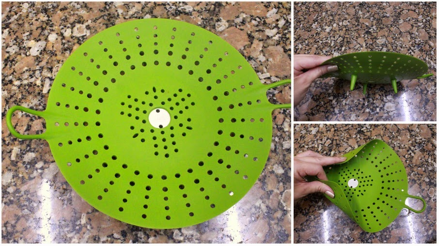 E olha esse disco que legal: é um disco de silicone pra cozinhar vegetais no vapor. Achei bárbaro. Como podem ver na foto, ele é super flexível. Basta encaixar na panela e deixar os vegetais em cima. Diz que é resistente ao calor, vamos ver. Esse foi mais carinho: $ 15,00.