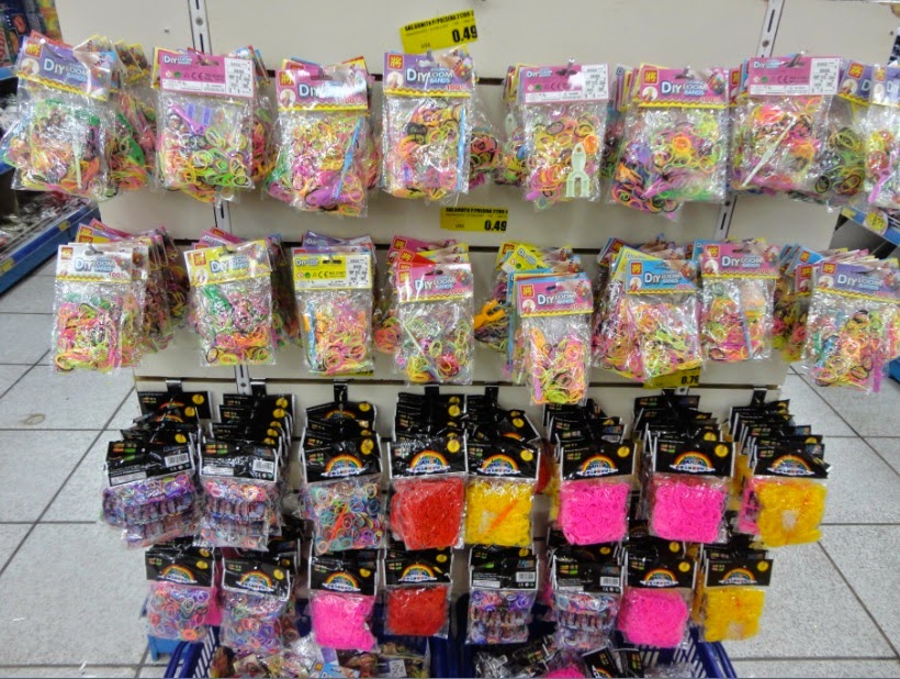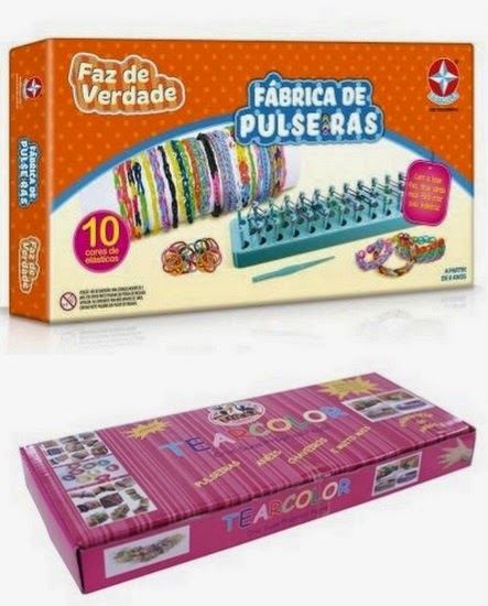 No Paraguai é possível encontrar as pulseiras em diversos lugares, inclusive nos mercadões. Uma loja que sei que vendem vários kits prontos, além de saquinhos individuais com 100 elásticos é na loja Toronto, no Shopping Americana. Aliás, eu comprei alguns saquinhos lá pra Nathy. Contei sobre isso pra vocês nesse POST (acessem que tem fotos das pulseirinhas que comprei com preços e também preços dos kits com tear por lá na época).
