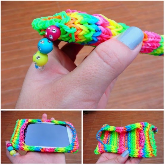 Estranharam uma case de elásticos ? É como eu disse: a criatividade é o limite. Já faz um tempo que os elásticos extrapolaram os limites dos pulsos. Viraram cases para celular, enfeites de cabelo, roupas e sapatinhos pra bonecas, sandálias e até mesmo roupas !