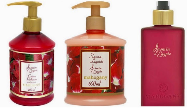 Outra coisa bacana dos produtos da Mahogany é que é comum eles terem os “primos” de cada aroma. Por exemplo, o Jasmin d’ Egypte tem sabonete líquido, creme hidratante e tem a fragrância também.