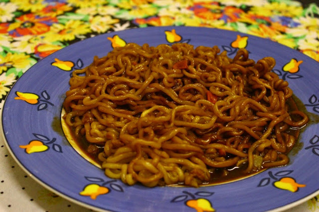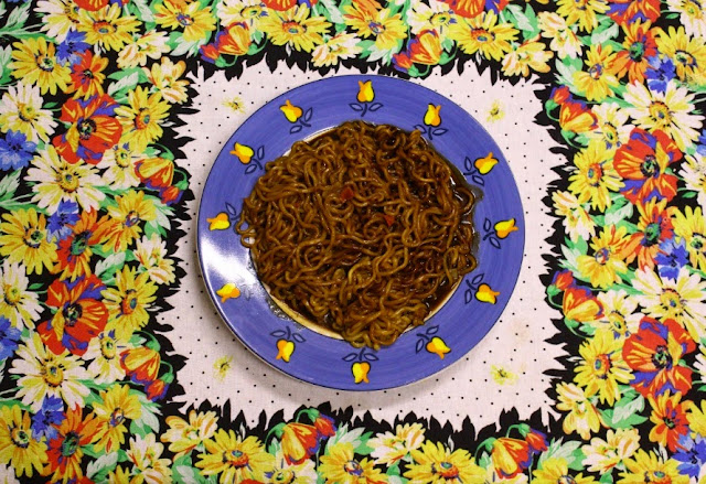 Esse macarrão tem um processo pra fazer um pouco diferente do nosso tradicional miojo. Ele vem com 3 saquinhos e não apenas o saquinho de tempero como o nosso macarrão “nissin” e similares. Além disso olhem a carinha da forma compactada circular que ele vem, que diferente. E esse prato abaixo é grande. Ou seja, vem um “tijolão” de macarrão !