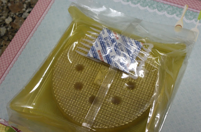 Ele vem prontinho pra ser levado pra um picnic. Até talher plástico acompanha ele. E quando espeto o talher no bolo, me dou conta que a textura é bem borrachuda.