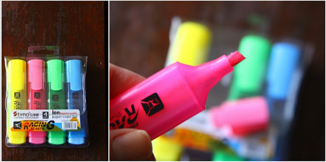 Comprei também um kit de canetas marca-textos, com 4 cores e com uma pontinha mediana pra fina. Bem boazinhas ! Nesse kit singelo paguei $ 1,50.