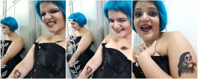 O toque especial foi dado com as tatuagens falsas. Eu pensava em ir em alguma loja de artigos festivos na minha cidade em busca de algumas mas foi uma surpresa imensa me deparar com várias delas no Mercadão América no Paraguai (o mesmo onde comprei as meias). Comprei várias pois não sabia ainda quais iria usar.