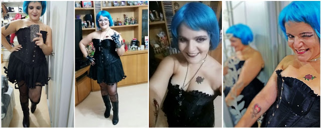 Pra montar esse look eu sabia que queria um visual todo preto e pensei em algo puxando mais pra um punk doido, por isso minha ideia inicial era que a saia de tule era essencial. A peruca azul eu já tinha visto numa loja e também já tinha como outro item certo pra compor meu look. Todos os outros itens foram surgindo aos poucos.