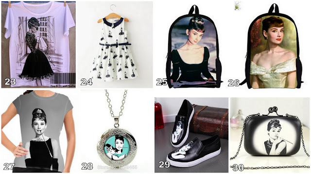 Outra maneira de homenagear a bonequinha de luxo é carregando-a no próprio corpo. Há uma infinidade de camisetas, regatinhas e muitos itens de vestuários inspirados em Audrey. Além dos acessórios ! Aqui temos t-shirst adulto (23 – Aliexpress; 27 – Tagrs) e vestidinho infantil (24 – Aliexpress), mochilas (25 e 26 – Aliexpress), cordões e bolsas ( 28 e 30 Aliexpress) e até mesmo modelos masculinos de calçados com estampas da Audrey (29 – Aliexpress).