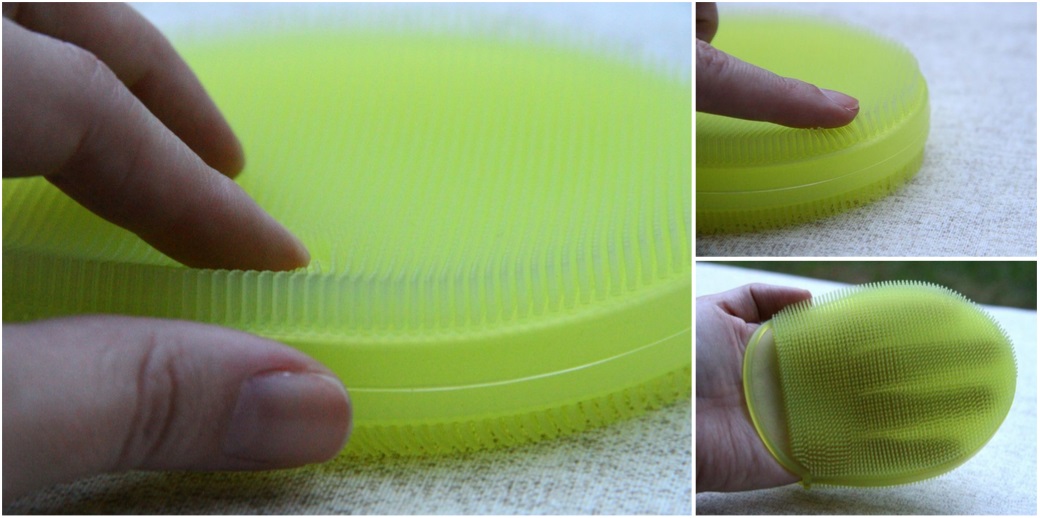 A esponja é feita de silicone e é super flexível e maleável. Embaixo tem uma abertura pra encaixar a mão e facilitar o uso. Ela é feita de várias equenas mini-cerdas que deslizam de forma muito gostosa na pele e como podem ver na foto é dupla-face, o que é muito bacana pois amplia a durabilidade do produto, já que você pode usar os dois lados. Claro que ainda tenho que testar direitinho pois por enquanto só senti na mão. Vamos ver no rosto.