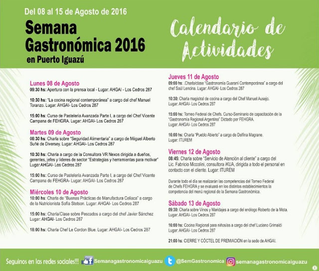 E além dessas opções de comilança haverão ainda cursos e workshops oferecidos neste período. Pra participar das palestras não é necessário vínculo com a área não: tem cursos voltados pra profissionais mas também outros voltados à comunidade em geral. A maior parte eles tem duração de 1 hora, mas é bom se informar direitinho pois tem palestra com estimativa de 3 horas de duração. Quem está organizando todo esse festival e os workshops é a AHGAI (Asociación Hotelera Gastronómica y Afines de Iguazú) com apoio de outras entidades ligadas ao turismo local.