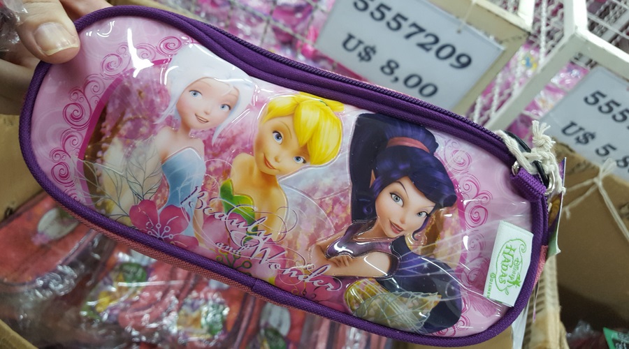 Tem vários tipos de estojos. Esse da sininho e amigas custava 1,50 dólares.