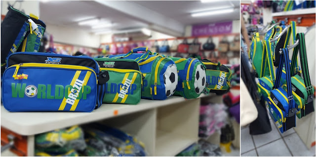 Outra coisa legal que vi por lá que achei interessante postar aqui foram esses modelos de bolsas pra quem curte jogar uma bola, praticar esportes, etc. Tem de vários tamanhos e servem tanto pra levar só a chuteira, como maiores que cabem várias coisas, até a bola se quiser.