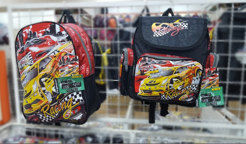 E são muitos modelos. Olha essa estampa de carros por exemplo. Vejam a variedade de tamanhos de mochilas e modelos para a mesma temática. E os preços também vão variando conforme o tamanho, número de compartimentos, bolsinhos. Essas abaixo de carros estavam custando por 5 algumas, 6,50 outras, e até por 8 dólares.