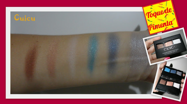 Comprei esses dois trios de sombra cintilante, um em tons azulados e cinza e o outro puxando pro marrom e dourado e com um iluminador bem branquinho cintilante pro cantinho do olho. Como podem ver, marca bem Xing-Ling mesmo.