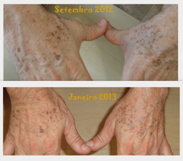 Acho que na mão esquerda o resultado ficou mais evidente. Importante frisar que as manchas da mão esquerda são mais acentuadas, até mesmo pela maior exposição ao sol, já que no caso dele as mãos ficam muito expostas em especial em viagens. Ele passou a vida toda muito tempo em estrada, com as mãos expostas portanto no volante. Via de regra, tanto a face esquerda, mão e braço esquerdo costumam nesses casos sofrer mais intensamente os efeitos do sol.