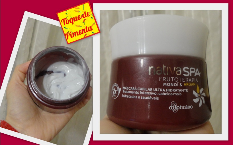 Bom, um dos produtinhos que andei testando e fiquei completamente encantada foi essa máscara do Boticário: a máscara de frutoterapia de Monoï e Argan da linha NATIVA SPA. Segundo a marca, trata-se de uma máscara de tratamento intensivo ULTRA HIDRATANTE. Pois conto pra vocês: é verdade !!! É pura hidratação !
