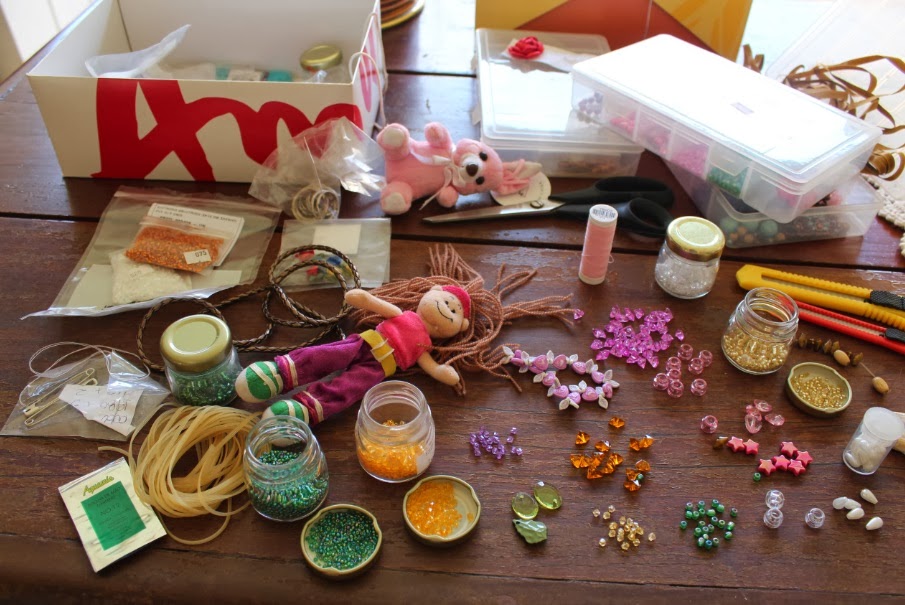 Bom, vamos dar uma olhadinha na boneca que usei para fazer o chaveiro e ao fundo materiais pré-selecionados: