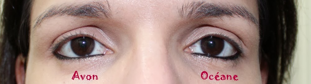 Comparem com uma passada na linha d’água apenas, entre o Avon e o Océane. Reparem como no lápis da Avon aparecem algumas pequenas falhas ao longo do traçado. E olha que esse é um dos meus lápis para olhos preferidos (é aquele que vem com a espuminha do outro lado pra esfumar). Já o lápis da Océane produz um traçado negro contínuo, sem falhas e mais reluzente. Além disso adere bem melhor.