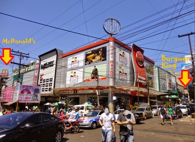 Onde fica? Também no lado direito, logo na entrada do Paraguai. Quando você entra na Avenida Principal da cidade (San Blás), logo se depara com um primeiro shopping imponente na direita, grande, espelhado: aquele é o prédio da S.A.X. Pois é naquela esquina, do outro lado, que fica o Mina India. Bom, o Mina India é como muitos outros shoppings da região: começa numa rua e entra quadra adentro, tendo saída pra rua de trás. Pois nas costas do shopping Mina India (rua de trás) você se depara com o estacionamento da Mina India e logo ao lado visualiza uma das entradas do shopping (ao lado da entrada na nova loja da S.A.Shop). Ali há uma placa interna do Burguer King. Agora se é ali na escadaria onde está a placa ou lá dentro em algum lugar, aí já não sei.
