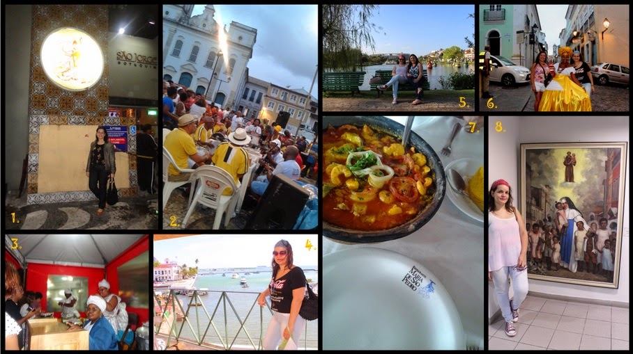 1. Botequim São Jorge (point charmoso e animado no Rio Vermelho) 2 Roda de Samba no Centro Histórico de Salvador (Igreja de São Francisco) 3. Simpáticas baianas atendendo no Acarajé da Dinha 4. Terraço dos restaurantes Maria de São Pedro e Camafeu de Oxossi (Mercado Modelo) 5. Dique do Tororó (ao fundo, as esculturas dos Orixás) 6. Pelourinho 7. Moqueca do tradicionalíssimo restaurante Maria de São Pedro 8. Memorial da Irmã Dulce (Museu do Anjo Bom)