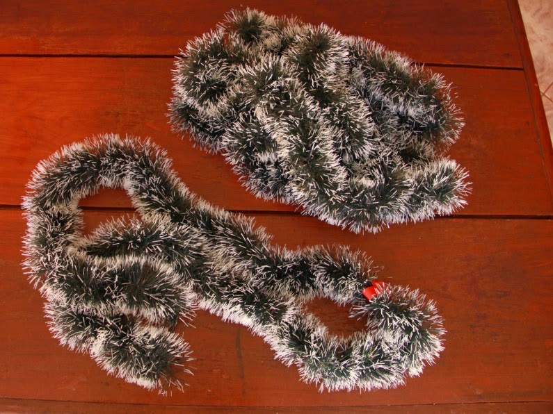 Também comprei 3 festões, que custaram 0,90 dólares cada. Optei por esse verde com “neve” nas pontas.