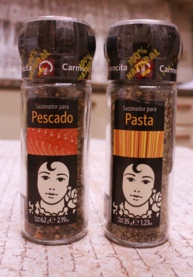 E teve ainda uns temperinhos prontos da marca espanhola Carmencita. O da esquerda é um tempero pronto para Pescados (tem sal marinho, pimentas cominho, tomate desidratado, cravo, canela, mostarda e mais alguns ingredientes que meu péssimo espanhol não decifrou).