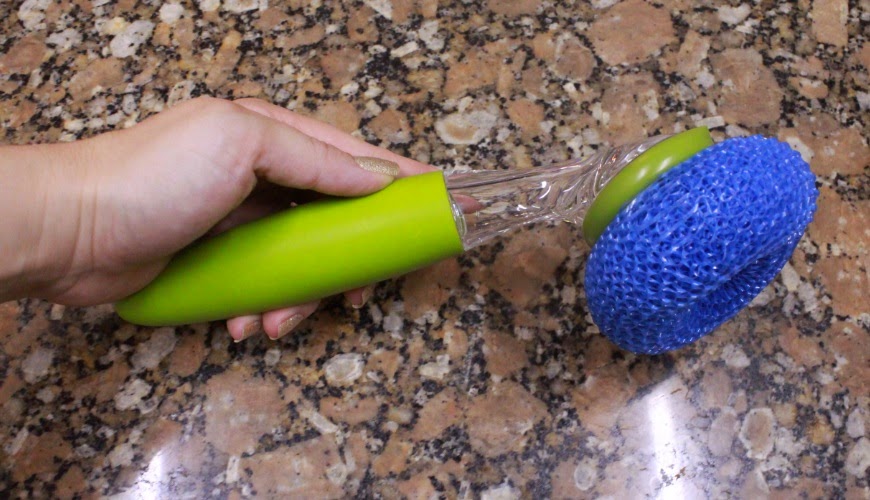 Já essa escova de limpeza é muito legal: ela vem com um recipiente pra você colocar o detergente. E esse disquinho azul promete facilitar a limpeza, inclusive de superfícies anti-aderentes, sem riscar ! Aliás, essa é a principal indicação dela, limpeza de utensílios de teflon, mas acho que você pode usar pra limpar de outros materiais também se quiser. Custou $ 9,00.