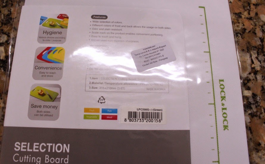 compras no ParaguaiEla pode ser usada dos dois lados, isso é bacana. E ela vem em diferentes cores, a sugestão deles é que você use cada cor pra determinado tipo de alimentos (peixe, carne, frutas e legumes). E no verso dela (branco e utilizável também) fica uma espécie de escala, pra você poder usar como medida caso precise cortar itens de tamanhos mais precisos ou iguais.