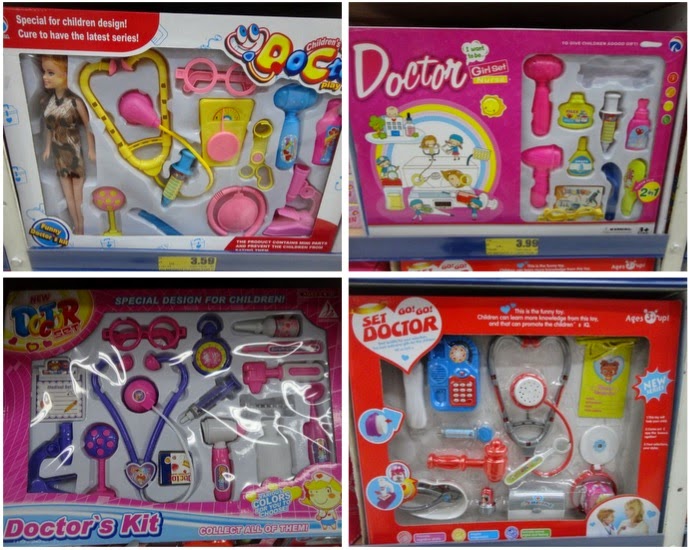 Como podem ver, tem várias opções de cartelas simples contendo alguns instrumentos gerais. São brinquedos bem baratinhos. E abaixo novamente opções com bonequinhas. Tem boneca enfermeira e boneca paciente.