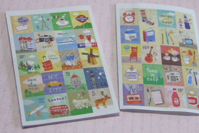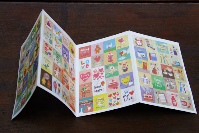 Cada 1 das 4 folhas da cartela tem uma temática: uma é de viagens, outra de festividades, outra de amor e outra é uma miscelânea de assuntos.