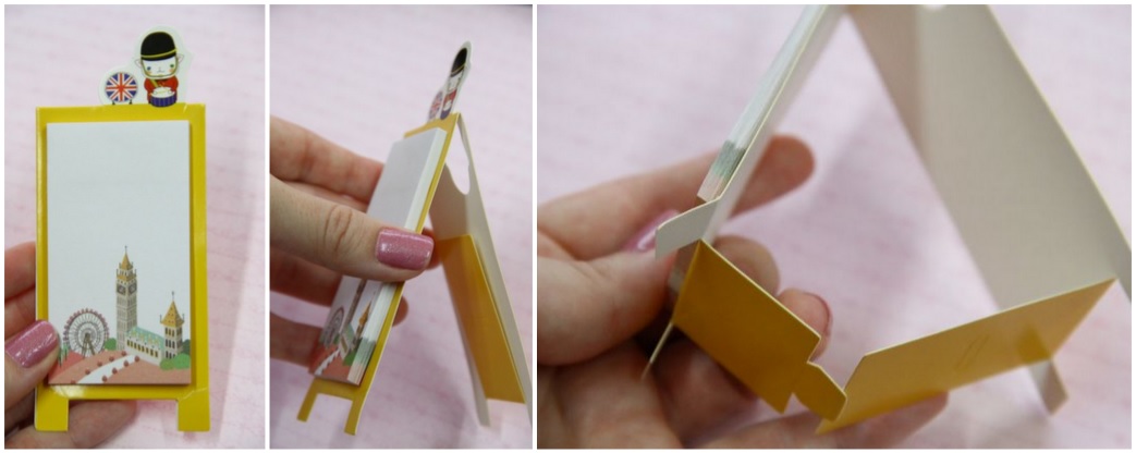 Já esses outros, também são modelos estilo post-it mas num formato de bloco de notas. E ele vem num “cavalete” de papelão enfeitadinho, possibilitando deixar seus recadinhos a vista, seja em cima da escrivaninha, mesa de trabalho, cozinha, etc.