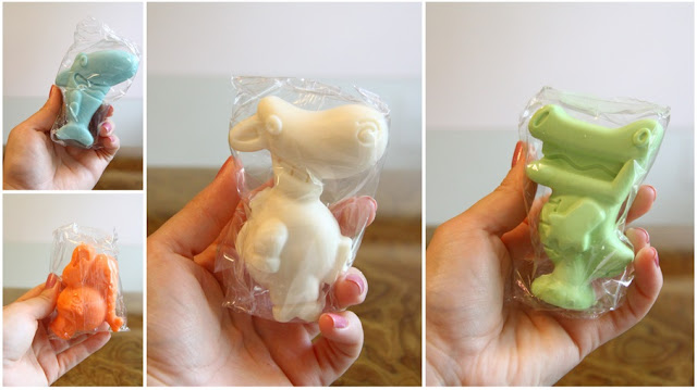 A caixa vem com sabonetes em formato dos animais mostrados na embalagem: tubarão, elefante, hipopótamo e jacaré.