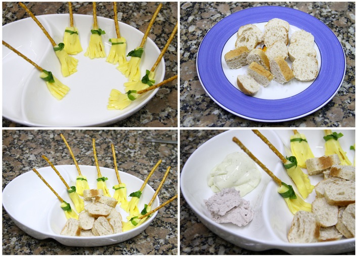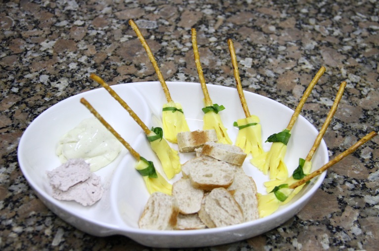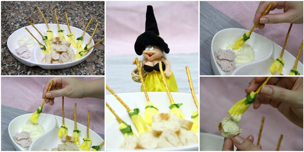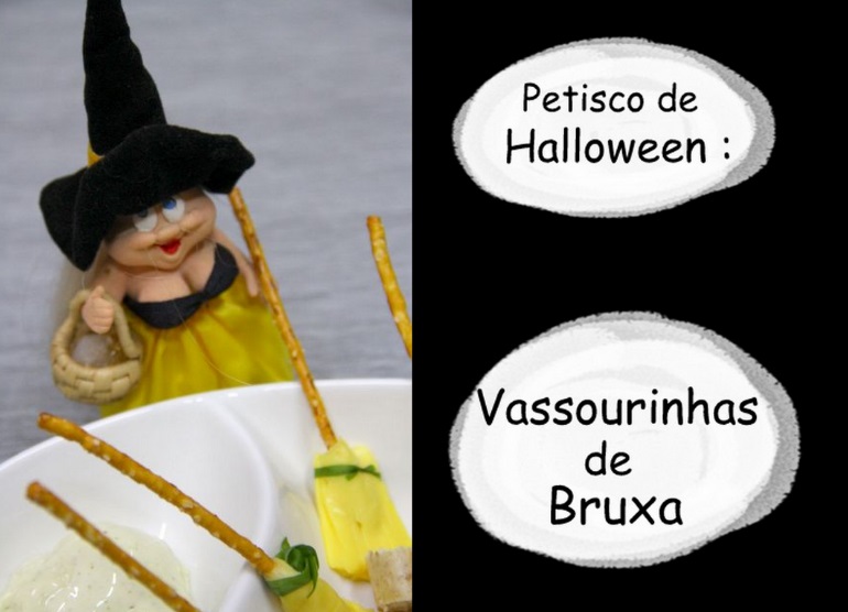 Basicamente a Vassourinha de Bruxa é feita a partir de snacks (salgadinhos) com queijo e como acompanhamento você pode colocar uma cestinha de pães e alguns molhos e patezinhos.