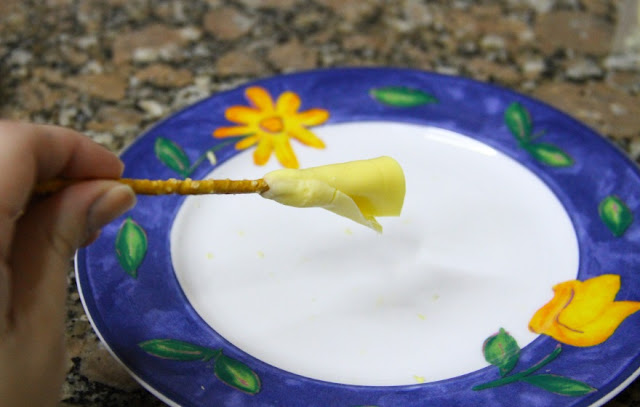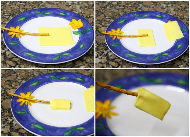 Para fazer o cabo da vassoura usei salgadinhos do tipo Stiksy (amo esse salgadinho ! Hmmm..). Eles são firmes e tem um aspecto perfeito pra imitar a madeira. Depois parti o queijo ao meio e dobrei ele com o palitinho já posicionado dentro. Você pode dar uma amassadinha na ponta pra deixar ele bem aderido. Ao fazer isso, você percebe que o queijo já fica bem fixo.
