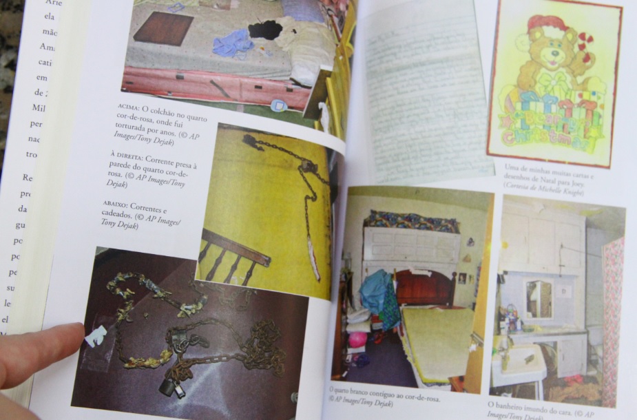 No meio do livro há algumas fotos. Tanto de Michelle criança, adolescente, ainda jovenzinha. E também fotos tiradas pela polícia da casa onde ela foi mantida refém. No decorrer do livro, você logo se familiariza com a casa pois ela descreve bem os cômodos e toda a sujeira. Ver fotos dos locais onde ela foi espancada e abusada é horrível. É como se fosse uma concretização maior dos crimes, materializados na sua mão.