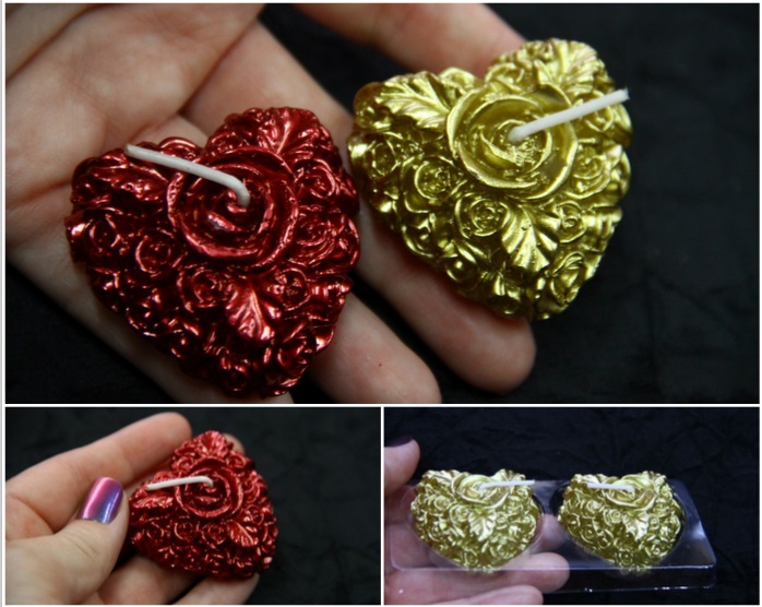 Além destas velas, encontrei essas outras velas pequenas e graciosas em formato de coração nas cores vermelha e dourada. Comprei 2 conjuntinhos de cada cor. Haviam também na cor prata, mas eu sabia que iríamos abusar mais do vermelho e dourado mesmo.