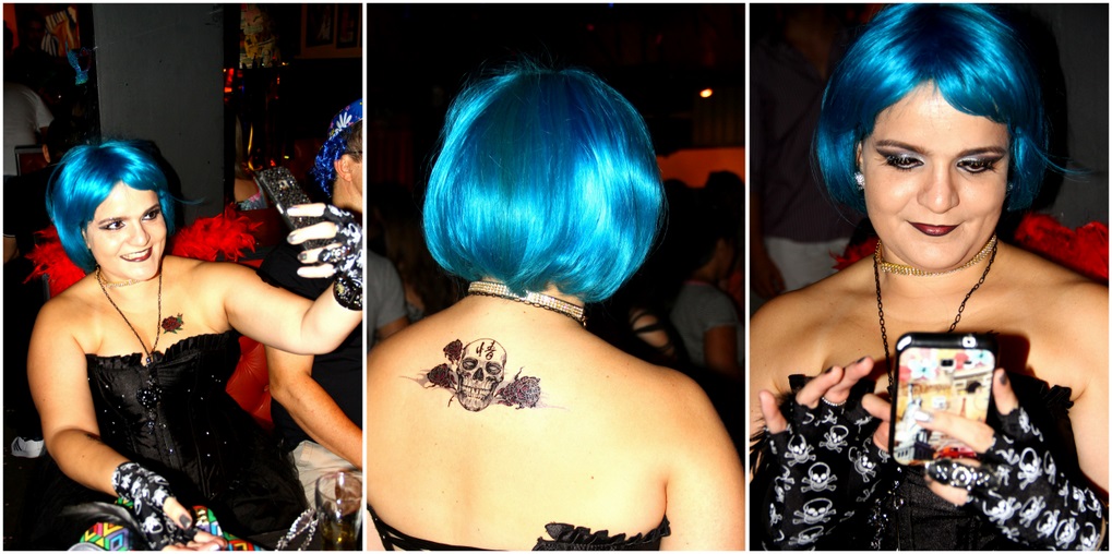 O toque especial foi dado com as tatuagens falsas. Eu pensava em ir em alguma loja de artigos festivos na minha cidade em busca de algumas mas foi uma surpresa imensa me deparar com várias delas no Mercadão América no Paraguai (o mesmo onde comprei as meias). Comprei várias pois não sabia ainda quais iria usar.