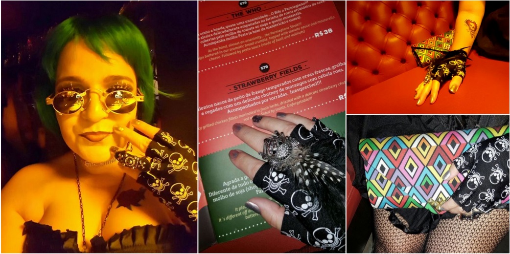 E já que eu podia ser over, ainda acrescentei dois anelões de caveira: um é esse anel de caveira com detalhe de penas – enfim, é carnaval mesmo ! Esse anel era de uma loja de bijuterias exóticas do Paraguai que infelizmente fechou. Eu amava comprar umas coisas diferentonas lá. E na outra mão, também um anelão de caveira, que não lembro onde comprei. Mas é acervo também.