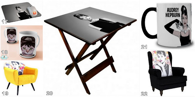 Claro que você pode incrementar sua decor com itens da Audrey de formas sutis ou bastante audaciosas. Por vezes um pequeno toque pode ser dado na sua bancada com um mouse pad (17 – Targs), uma canequinha (18 – Lojas Ton; 21 Mercado Livre), mas alguns itens são mais exuberantes, como essas maravilhosas poltronas da Submarino (19 e 22) podem ser o foco da decoração em um ambiente. No centro (29 – Targs) uma toalha de mesa com uma das clássicas fotos de Audrey Hepburn.