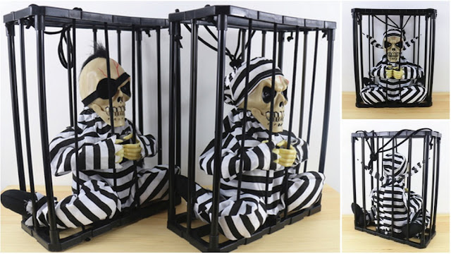 E como ainda não me cansei de falar das caveiras, vou mostrar agora um bibelozinho muito engraçadinho e que é menorzinho e tem um preço mais em conta. Afinal de contas os últimos itens estão mais abusadinhos de preço né ? Então vamos de um esqueletinho presidiário que cabe um pouco mais no bolso. A surpresa é que ele vem com pilhas e o som emitido realmente é um mistério. Em algum ponto do anúncio é mencionado sobre som de mordaça, mas a grande sacada é que o esqueleto escapa da jaula em dado momento. Enfim, não dá pra entender direito o funcionamento no anúncio. Mas parece bacaninha.