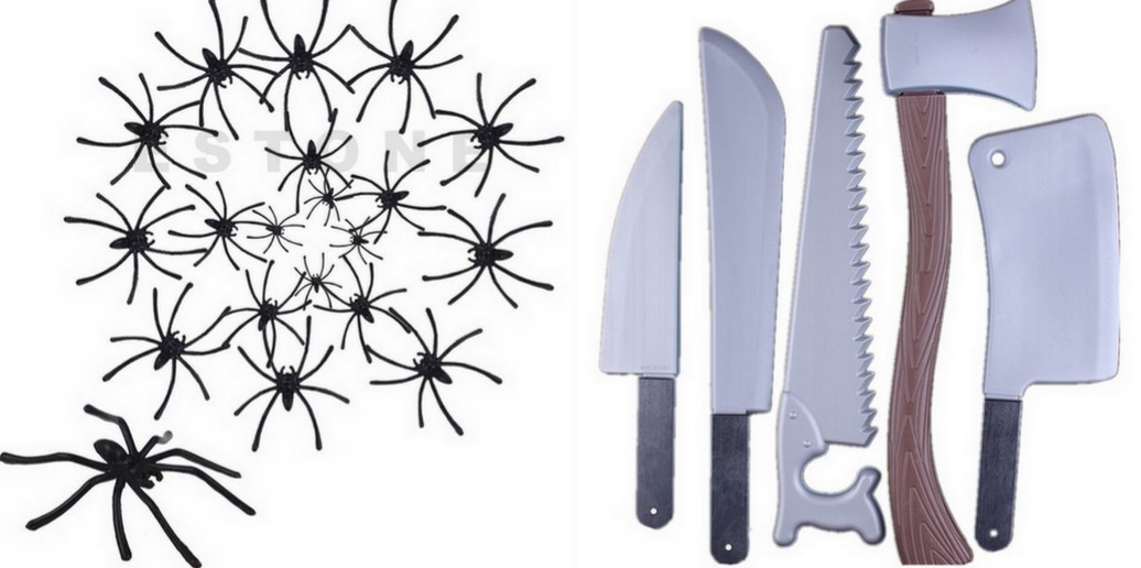 E pra ajudar na decoração da teia você pode comprar insetos plásticos avulsos ou em kits. Encontrei um kit que vem com várias aranhas plásticas pequeninas. E também um kit cheio de facas e serrote e afins em plástico. Também complementam bem a decoração.