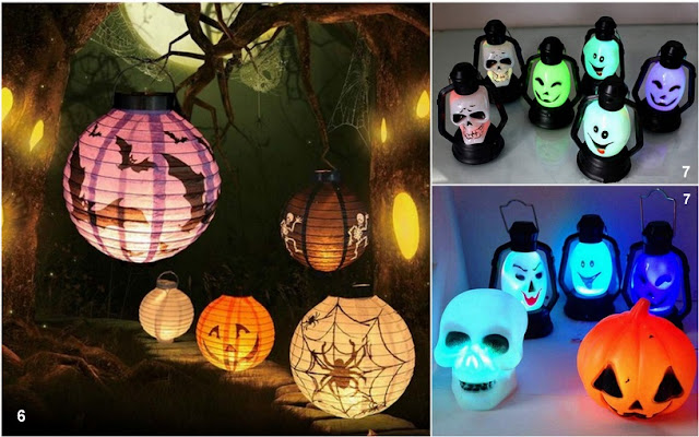 E é claro que não faltam itens decorativos quando se pensa em Halloween. Vou mostrar algumas opções de iluminação pra dar um toque todo charmoso. Adoro essas nesse estilo japonês, pra serem penduradas no jardim. São uma graça. E outra opção são esses candeeiros de fantasminhas, caveiras, de monstrinhos alegrinhos.