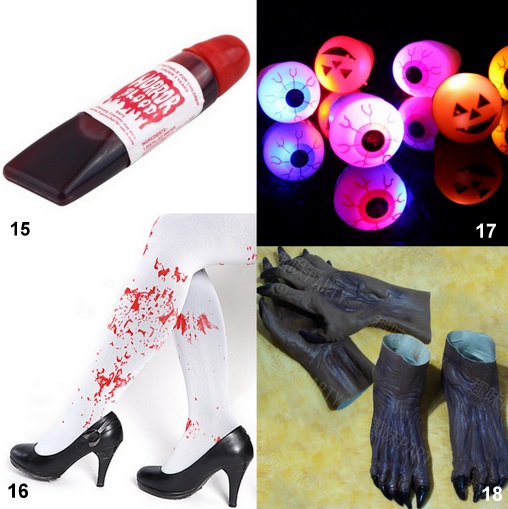 E já que estamos falando em como dar um UP no look para o Halloween, já vou aproveitar pra mostrar outros achados bacanas e com preços simpáticos. Tem sangue falso, anel divertido de terror, meias com sangue e umas luvas e meias de monstros muito horripilantes.