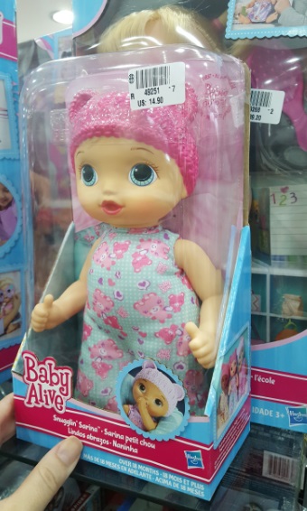 Dessas duas abaixo, a Baby Alive “Escolinha” estava $ 49,00 doletinhas enquanto na Kabum no Brasil ela estava R$ 150,00, bem mais em conta que no Carrefour, onde a Escolhnha loirinha estava saindo por R$ 190,00. A do lado, Super Snacks – Hora de Comer, eu encontrei na Casa Belem do Shopping Americana por $ 55,00 enquanto no Shoptime era possível encontrar ela por R$ 217,00 reais.
