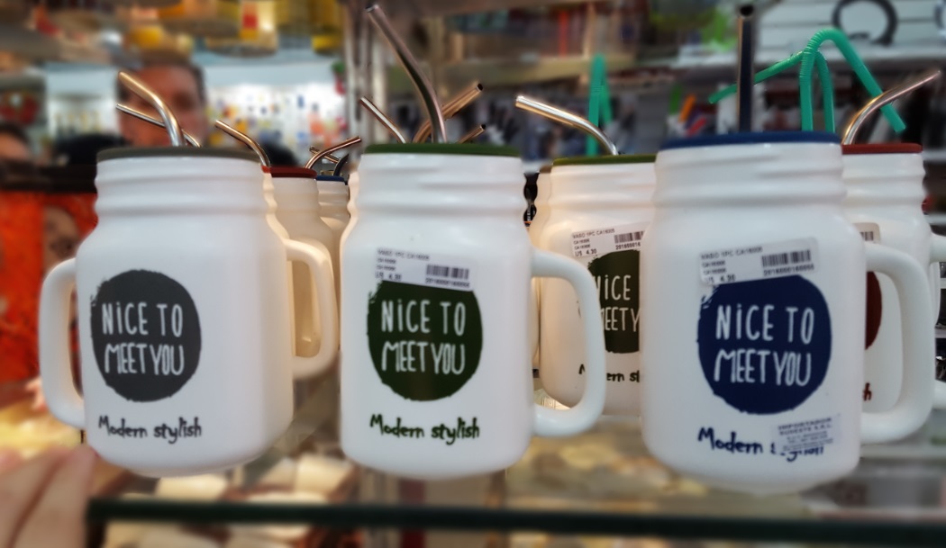 Adorei essa junção de cores vibrantes com esse desenho lindo. Outras canequinhas muito graciosas que tinham por lá foram estas abaixo. Notem o canudo de aluminio (imagino que não é inox pelo menos hehe) que acompanha – que bacana. Essas canecas saíam por $ 4,30 cada e também encontrei lá na Casa China.