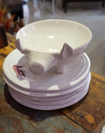Estou falando em jogo pois cada peça é de um animalzinho mas na verdade vários destes itens de jantar e louçaria lá não são vendidos em conjunto. Ou seja, você pode comprar separadamente. Essas louças mesmo tinham os pratos grandes e os menores. E outra coisa fabulosa que tinha era esse pratinho pra servir linguiça ou torresmo, em forma de porquinho: