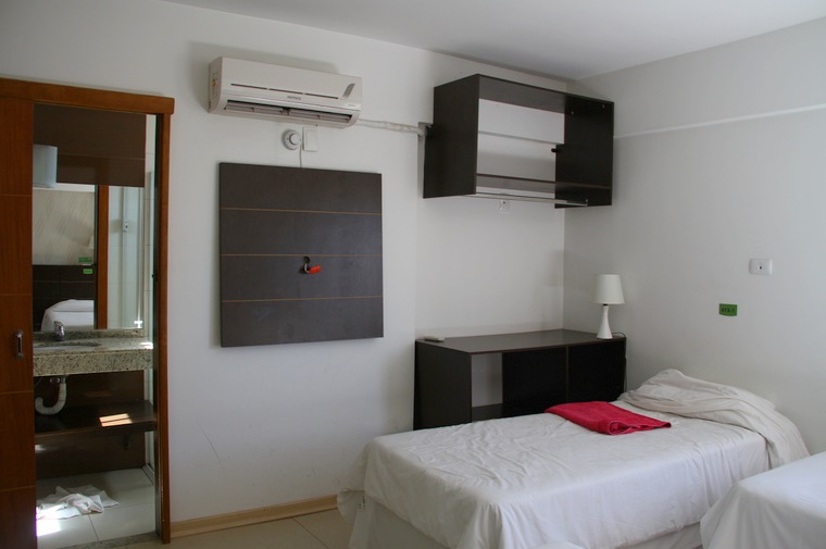 Mas ainda sobre o quarto …. cada cama conta com tomadas próprias uma luz adicional em cima. Também uma mini-bancada em cima que dá pra deixar apetrechos pessoais. O banheiro não é grande nem pequeno, o box um pouco pequeno. Tive um pouco de dificuldade pra me acertar com o chuveiro mas o banho é quente. A iluminação do quarto de dia é ótima por conta da boa luz natural mas a noite é aquela típica iluminação intimista que os hotéis insistem em usar (vulgo: penumbra !) … mas isso é mal de tudo que é hotel. Cara, como eu amo hotel que tem quarto iluminado !!! Bom, mas não é o caso. De qualquer forma eu não senti falta de uma iluminação maior visto que estava dividindo quarto e portanto não iria cumprir minha rotineira leitura noturna antes de dormir.